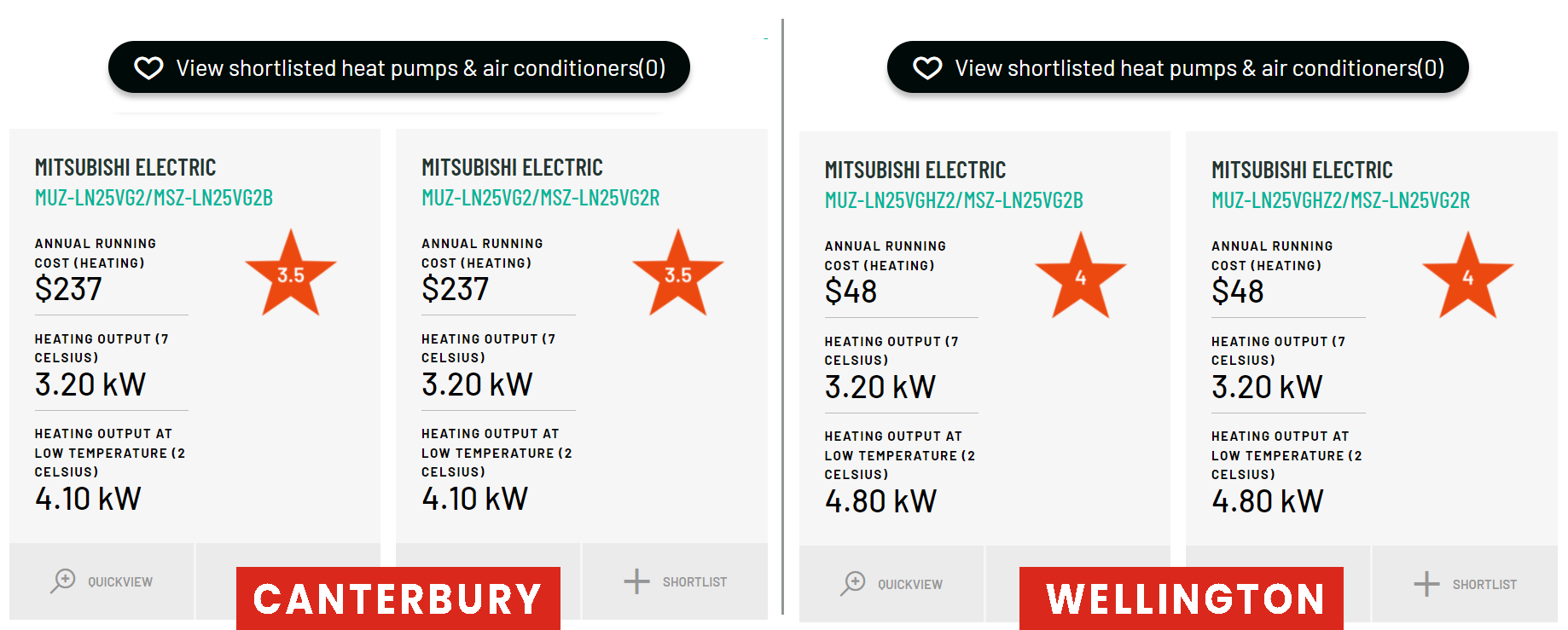 This calculator helps you compare the energy efficiency of any appliance with an energy rating label. But the real magic is when you compare heat pumps, you get to select where you live in New Zealand from 18 options: