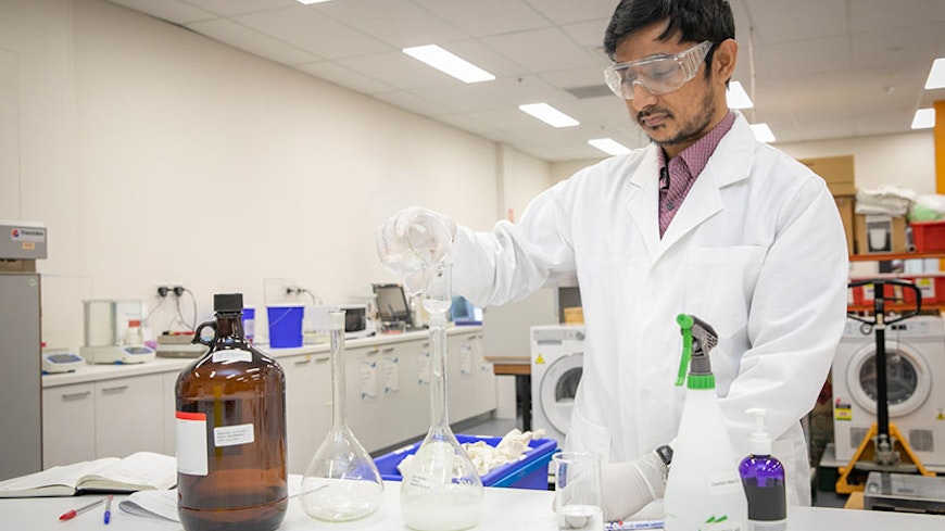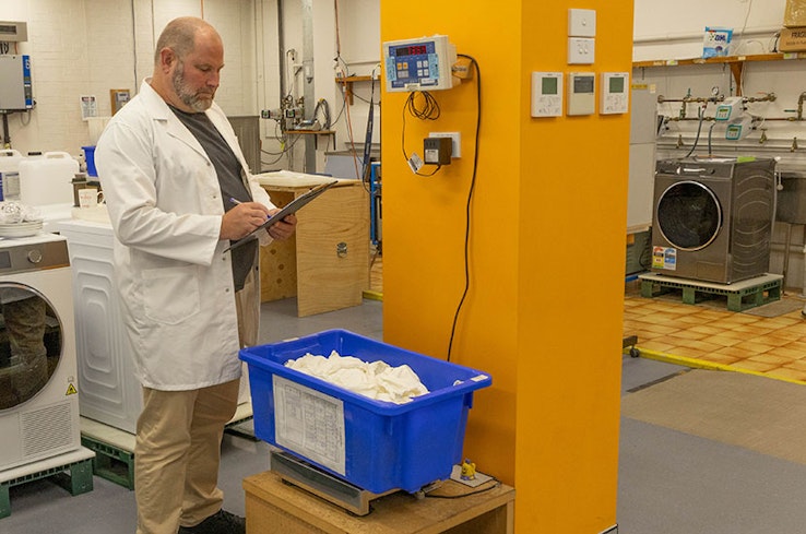 Specially prepared swatches of fabric, pre-stained with a specific amount of dirt, are attached to a standard wash-set of linen garments. These swatches are the same as those used for international Standards tests.