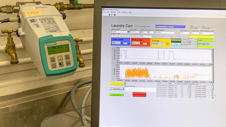 We add a special marker chemical to the wash and take a water sample at the end of the final cycle. The amount of this chemical left in the rinse water determines how well the machine has rinsed out dirt and removed detergent.